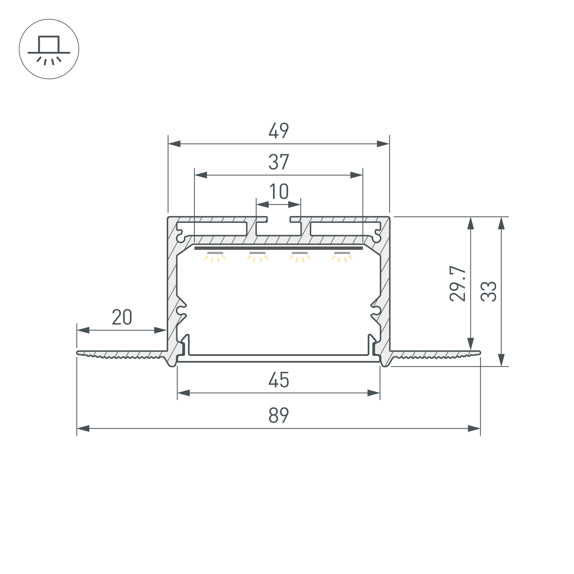 Встраиваемый профиль со скрытым фланцем из анодированного алюминия для создания линий света на потолке и стенах из ГКЛ. Габаритные размеры профиля составляют 3000 мм в длину, 89 мм в ширину и 33 мм в высоту, паз для установки 49 мм. Площадка для установки светодиодных лент позволяет использовать ленту шириной до 37 мм и мощностью до 53,6 Вт/м. Это обеспечивает гибкость в выборе светодиодных лент и создает потрясающие световые решения. Экраны, заглушки и другие аксессуары не включены в комплект и приобретаются отдельно. Цена указана за 1 метр профиля. Отличное решение для создания современных световых проектов.
